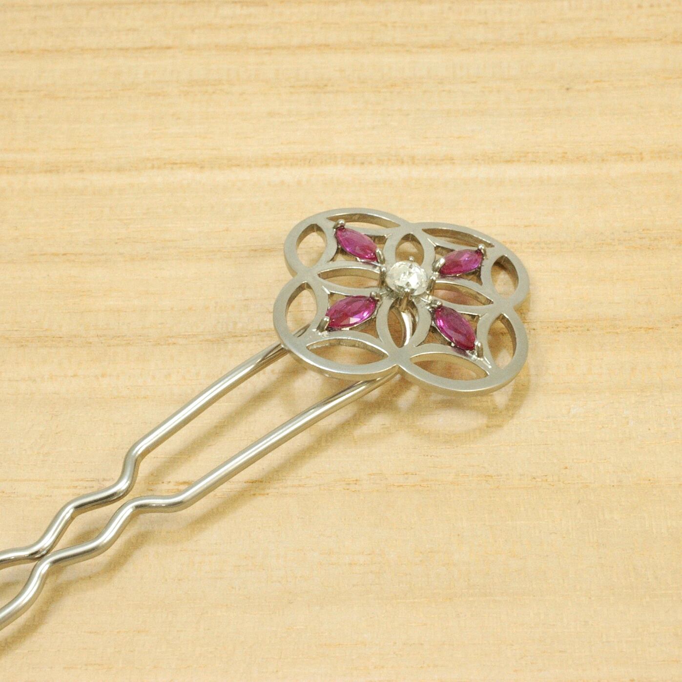 七宝柄の中心キュービックジルコニアに、マーキスカットの合成ルビーを4粒をクロスに留め、かんざしで表現しました。